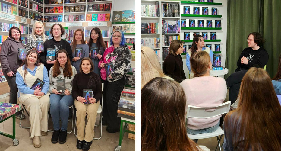 «Презентація книги «Донька диму й кісток» з Ангеліною Медведєвою у Луцьку. Справа внизу на першому фото та зліва на другому — літературна редакторка Наталія Матвійчук».