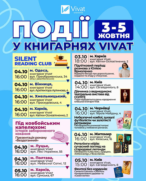 Традиційно вибрали для вас кілька книжкових заходів, які організовано Vivat та проходитимуть у офлайн-книгарнях. Вибирайте подію собі до смаку й у вашому місті та приєднуйтеся до презентацій і обговорень.