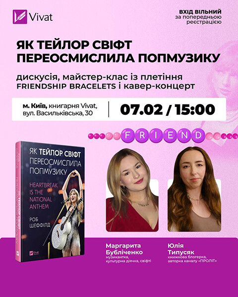 Цими вихідними у Києві прихильники Тейлор Свіфт та люди, зацікавлені в музиці, шоу-бізнесі й книжках, запрошені на обговорення життя і карʼєри Тейлор Свіфт крізь призму книжки Роба Шеффілда «Як Тейлор Свіфт переосмислила попмузику».