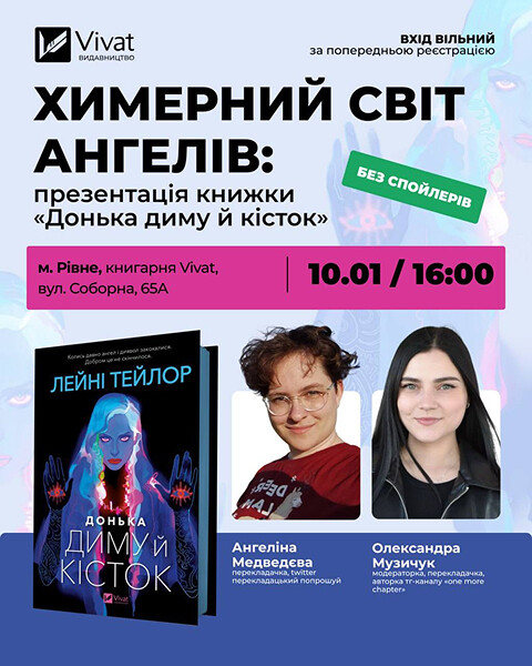 Говоритимемо без спойлерів про ангелів і демонічних істот, міфологію, магію слова та те, як ця історія заговорила українською. А також дослідимо, як авторка Лейні Тейлор знайомить із світоустроєм, як змушує читачів вірити в повноту їхнього розуміння сетинґу, а потім перевертає хід подій.