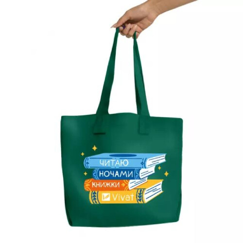На передзамовленні новенький шопер для книголюбів з надписом «Читаю ночами книжки Vivat». Яскравий аксесуар чудово доповнить будь-який образ, зручний у використанні: має довгі ручки, кнопку-застібку та окрему кишеню для дрібничок.