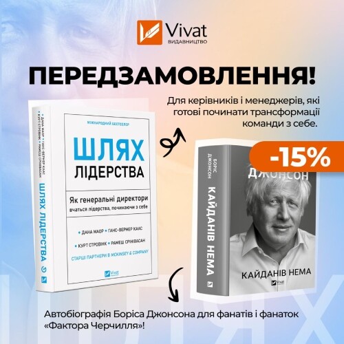 📖 Книга «Шлях лідерства. Як генеральні директори вчаться лідерства, починаючи з себе» створена у колаборації Vivat та VCHASNO GROUP — у межах ініціативи з розвитку лідерського потенціалу й управлінських талантів «Перекладаємо Вчасно». Це нонфікшн про сучасне лідерство, що поєднує досвід McKinsey & Company з інсайтами провідних CEO. Спираючись на реальний досвід, автори показують, як внутрішня трансформація лідера стає ключем до ефективного управління та розвитку компанії. Автори підкреслюють важливість готовності лідера до саморефлексії, роботи над страхами й помилками, здатності ухвалювати непрості рішення та брати відповідальність, надихати власним прикладом.