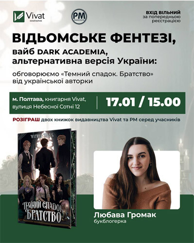 Разом з авторкою обговоримо роман «Темний спадок. Братство» — відьомське фентезі з атмосферою темної академії, що переносить в альтернативну версію України, а головна героїня шукає ключ до давньої таємниці в серці Карпат.