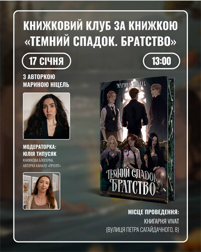 Запрошуємо на атмосферну зустріч за романом «Темний спадок. Братство» Марини Ніцель.Поговоримо про світ книжки, альтернативну версію України, естетику dark academia, архетип відьми в сучасному тексті та про те, як українські автори сьогодні працюють із жанром темного фентезі.