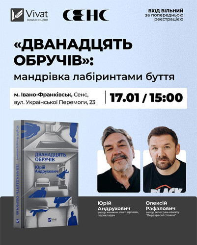 «Дванадцять обручів» — роман-лабіринт, у якому Карпати стають простором екзистенційного пошуку, а страх пізнати себе — головним випробуванням. Запрошуємо на зустріч, призначену знаковому тексту Юрія Андруховича — інтелектуальній белетристиці про пам’ять, ідентичність, дуалізм життя і смерті, містику й пострадянський хаос. Говоритимемо про багатошаровий наратив, персонажів, які блукають лабіринтами власної свідомості, і про те, чому цей роман досі резонує з нашим досвідом.
