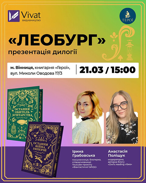 Відвідайте презентацію дилогії «Леобург» української фантастки Ірини Грабовської. Приєднайтеся до розмови з авторкою про стимпанк, паралельні світи, боротьбу за свободу, детективні розслідування, політику та романтику у цих пригодницьких книжках.