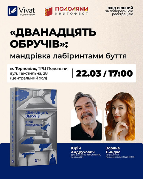 Запрошуємо на серію подій, присвячених знаковому тексту Юрія Андруховича — роману «Дванадцять обручів». Це роман-лабіринт, інтелектуальна проза про пам’ять і ідентичність, тонку межу між життям і смертю, пострадянський хаос і людину, що намагається віднайти себе серед усього цього.