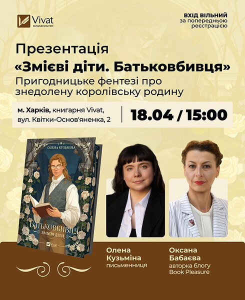 Цими вихідними презентація книги Олени Кузьміної «Змієві діти. Батьковбивця» проходитиме у Харкові. Приходьте послухати про нове пригодницьке фентезі з політичними інтригами, гострим гумором і героями, які постійно опиняються в небезпеці, комічних ситуаціях та страждають від мук вибору. Дізнайтеся про те, як вибудовується пригодницьке new adult-фентезі для дорослої аудиторії, як працювати з репрезентацією і соціальними темами, а також чому іронія та гумор стають інструментами напруги. Поставте запитання авторці.