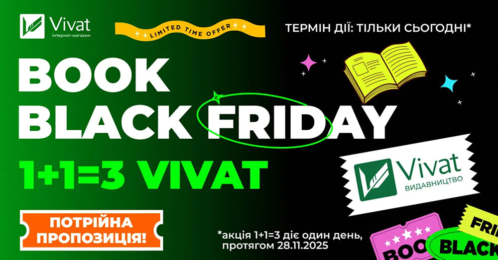 У пʼятницю 28 листопада, тільки 1 день, в нас діє пропозиція 1+1=3 на всі книжки видавництва Vivat.