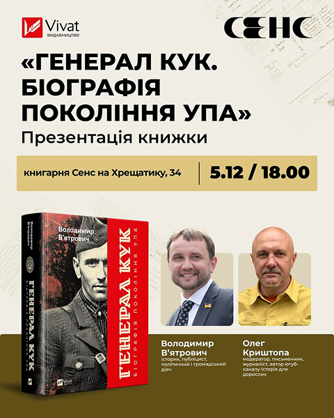 Історик, автор книжки «Генерал Кук. Біографія покоління УПА» Володимир В’ятрович та письменник, журналіст і автор ютуб-каналу Історія для дорослих Олег Криштопа на цій зустрічі говоритимуть з присутніми про шлях Василя Кука — від юності до керівництва УПА. Ви зможете поставити спікерам запитання й отримати підпис автора на своєму примірнику книжки. Запрошуємо долучитися.