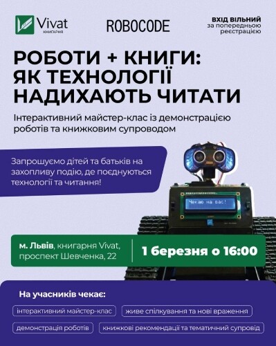Запрошуємо дітей та дорослих на інтерактивні майстер-класи від школи робототехніки Robocode у книгарнях Vivat. Ми поговоримо про те, як ідеї з книжок перетворюються на справжніх роботів, які рухаються, думають і допомагають людям — і як зробити перший крок у світ технологій. Представимо унікальних роботів — Кванта, Лео, Сенсокота, Сумо, Воллі та Джексона, аби детальніше розібратися хто такі роботи і як сенсори, моторчики та програма перетворюють ідею на рух.