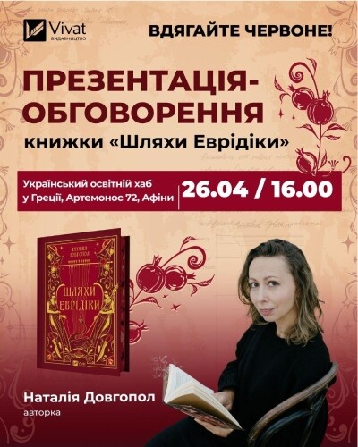 Запрошуємо на першу в Греції презентацію нового пригодницького роману Наталії Довгопол «Шляхи Еврідіки». На зустрічі розмовлятимемо про переосмислення давньогрецького міфу, мандруватимемо вулицями Києва та Афін, дізнаємося, в чому секрет елевсинських містерій та культу орфіків у Давній Греції і не тільки.