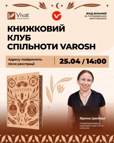 Вхід вільний за попередньою реєстрацією. Після реєстрації ви отримаєте деталі, як приєднатися до Спільноти Varosh і долучитися до зустрічей книжкового клубу.