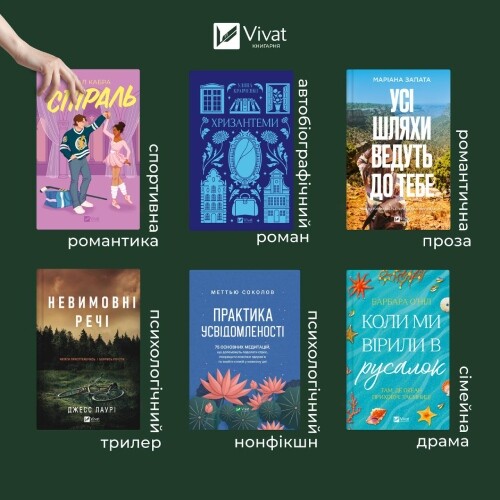 У телеграм каналі «Книгарня бестселерів Vivat» триває розіграш шести книжок: серед них психологічний трилер і спортивний ромком, вишукана класика і сучасна проза, а ще корисний нонфікшн з техніками для тренування усвідомленості.