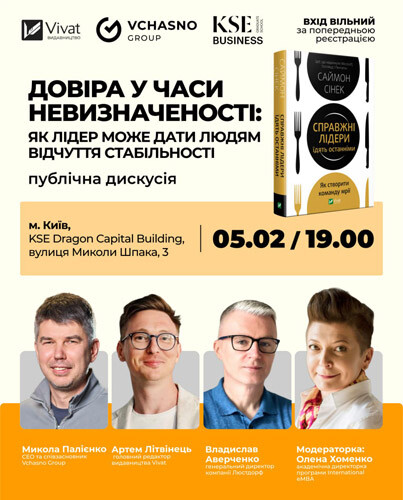На події з Vivat, Vchasno Group та KSE говоритимемо про ідеї Саймона Сінека з книжки «Справжні лідери їдять останніми»: як лідер може створити відчуття безпеки, збудувати «Коло довіри» й підтримати команду в часи змін. Про лідерство, яке тримає — навіть коли все навколо хитке.