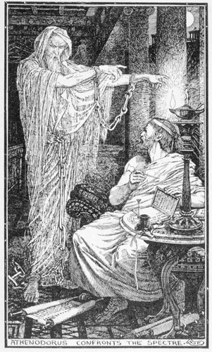 Будинок пустував, доки в Афіни не прибув філософ Атенодор. Він саме шукав помешкання і зацікавився будівлею — а вона ще й продавалася за нижчою ціною. Історія про примару не відштовхнула чоловіка, а навпаки додала йому охоти поселитися там. Атенодор був стоїком, на новому місці він перебував у гармонії зі своїм розумом та тілом: коли вночі перед ним з’явився привид, філософ підготувався до цього і спокійно займався писанням. А коли привид поманив його пальцем, Атенодор закінчив роботу та послідував за ним.