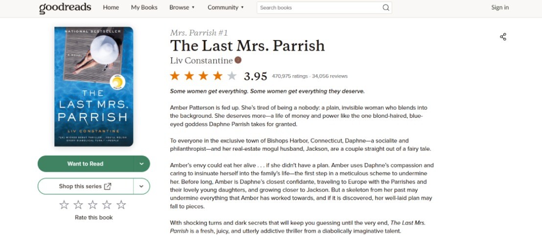 За завісою ідеального життя заможної родини ховаються дуже неприємні та небезпечні речі. Ембер вигадує все нові й нові деталі своєї біографії, щоб вразити Дафні. Але факти з реального минулого можуть зруйнувати її блискучу стратегію. Що вона робитиме, коли все піде шкереберть? Авторки також більше розкажуть про життя Дафні, яке виглядає абсолютно довершеним тільки збоку. За дверима свого розкішного маєтку Перріші ховають секрети, що викликають у читачів широкий спектр емоцій. Тож на які ризики готова піти Ембер, щоб стати новою місис Перріш, і чи вийде у неї це зробити?