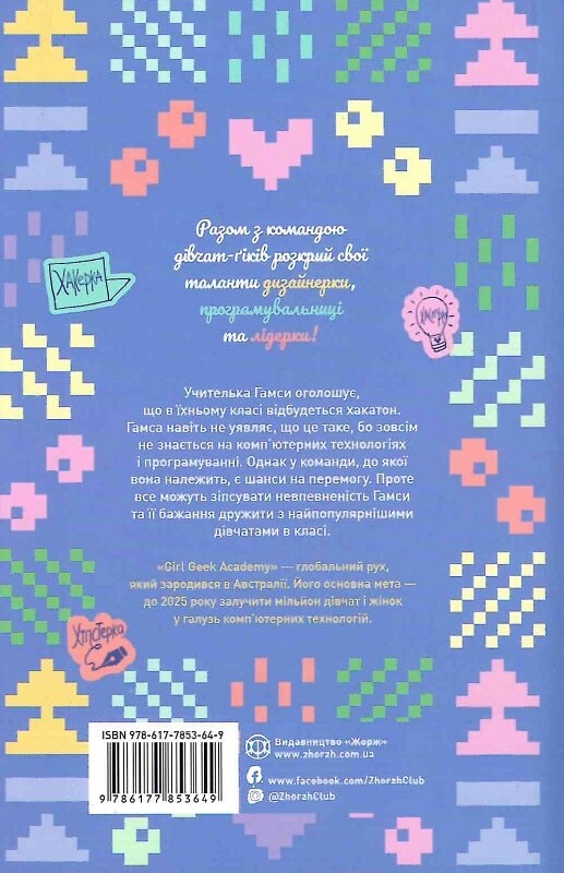 Ще вчора Ганса анічогісінько не тямила в комп’ютерних технологіях. А вже сьогодні вона має очолити команду, яка візьме участь у шкільному змаганні стартапів — хакатоні. Четверо дівчат повинні розробити власний онлайн-застосунок і представити його журі. На щастя, серед них є крута дизайнерка Ів і хакерки Нікі та Меґґі. Головне, щоб Ганса, яку призначили лідеркою команди, не зіпсувала все через невпевненість і страх бути самою собою. Girl Geek Academy — глобальний рух, який зародився в Австралії. Його основна мета — до 2025 року залучити мільйон дівчат і жінок у галузь комп’ютерних технологій.